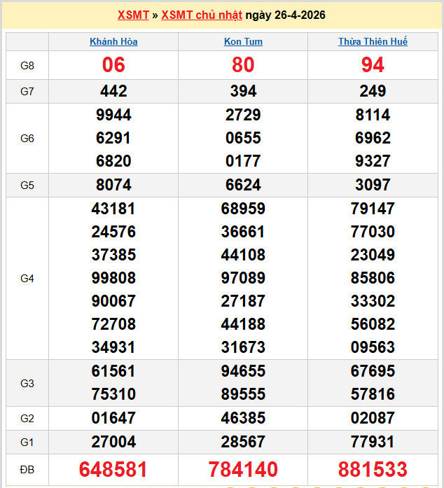 Chuyên gia Lô Đẹp Hôm Nay dự đoán soi cầu XSMT 26-4-2026 Chủ Nhật hàng tuần. Cùng các cao thủ chốt số giờ vàng gồm đài XS Khánh Hoà – Kon Tum và tần xuất lô tô đang chạy điều, để đưa ra tính toán xác xuất dự đoán kết quả cầu lô giải đặt biệt đầu đuôi, giải lô tô 2 số, lô xiên chính xác nhất, được thực hiện bởi Admin và cùng hàng nghìn thành viên tham gia tại diễn đàn của chúng tôi..