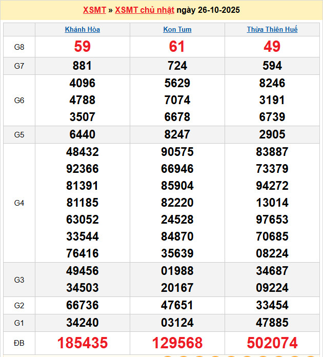 Chuyên gia Lô Đẹp Hôm Nay dự đoán soi cầu XSMT 26-10-2025 Chủ Nhật hàng tuần. Cùng các cao thủ chốt số giờ vàng gồm đài XS Khánh Hoà – Kon Tum và tần xuất lô tô đang chạy điều, để đưa ra tính toán xác xuất dự đoán kết quả cầu lô giải đặt biệt đầu đuôi, giải lô tô 2 số, lô xiên chính xác nhất, được thực hiện bởi Admin và cùng hàng nghìn thành viên tham gia tại diễn đàn của chúng tôi..